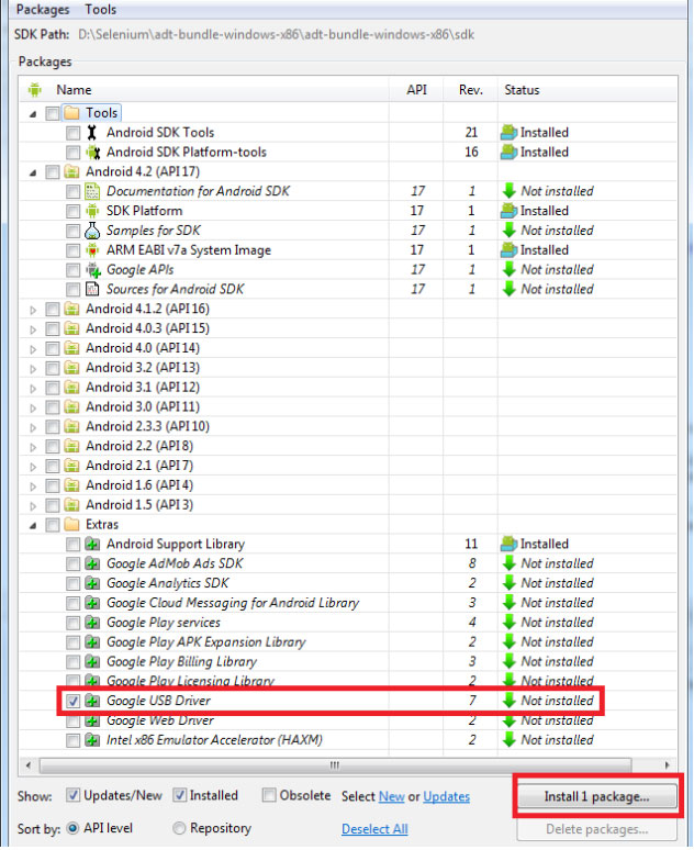 Abrimos el Android SDK Manager y descargamos los USB Drivers. Al estar conectado el dispositivo móvil,