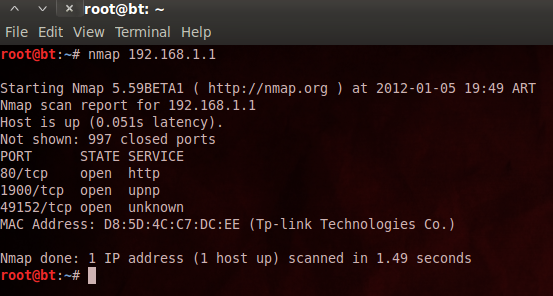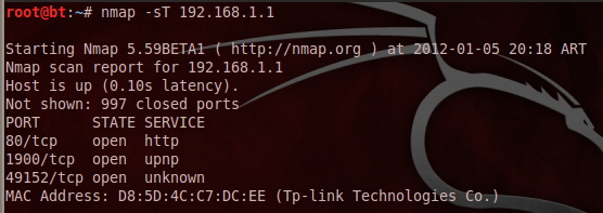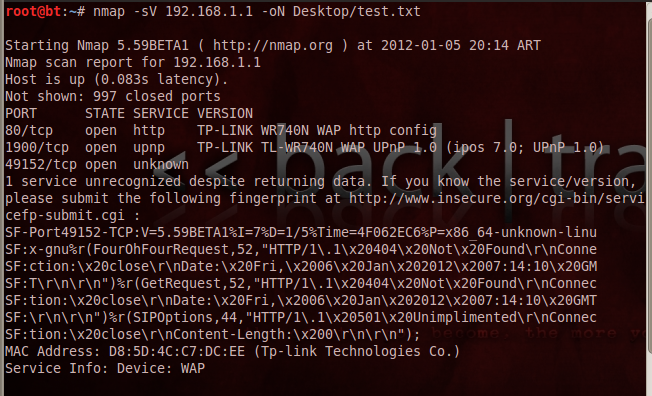 # Nmap 5.59BETA1 scan initiated Thu Jan 5 20:14:06 2012 as: nmap -sV -oN Desktop/test.txt 192.168.1.1 Nmap scan report for 192.168.1.1< Host is up (0.083s latency). Not shown: 997 closed ports PORT STATE SERVICE VERSION 80/tcp open http TP-LINK WR740N WAP http config 1900/tcp open upnp TP-LINK TL-WR740N WAP UPnP 1.0 (ipos 7.0; UPnP 1.0) 49152/tcp open unknown 1 service unrecognized despite returning data. If you know the service/version, please submit the following fingerprint at http://www.insecure.org/cgi-bin/servicefp-submit.cgi SF-Port49152-TCP:V=5.59BETA1%I=7%D=1/5%Time=4F062EC6%P=x86_64-unknown-linu SF:x-gnu%r(FourOhFourRequest,52,"HTTP/1\.1\x20404\x20Not\x20Found\r\nConne SF:ction:\x20close\r\nDate:\x20Fri,\x2006\x20Jan\x202012\x2007:14:10\x20GM SF:T\r\n\r\n")%r(GetRequest,52,"HTTP/1\.1\x20404\x20Not\x20Found\r\nConnec SF:tion:\x20close\r\nDate:\x20Fri,\x2006\x20Jan\x202012\x2007:14:10\x20GMT SF:\r\n\r\n")%r(SIPOptions,44,"HTTP/1\.1\x20501\x20Unimplimented\r\nConnec SF:tion:\x20close\r\nContent-Length:\x200\r\n\r\n"); MAC Address: D8:5D:4C:C7:DC:EE (Tp-link Technologies Co.) Service Info: Device: WAP Service detection performed. Please report any incorrect results at http://nmap.org/submit/ . # Nmap done at Thu Jan 5 20:15:46 2012 -- 1 IP address (1 host up) scanned in 100.25 seconds