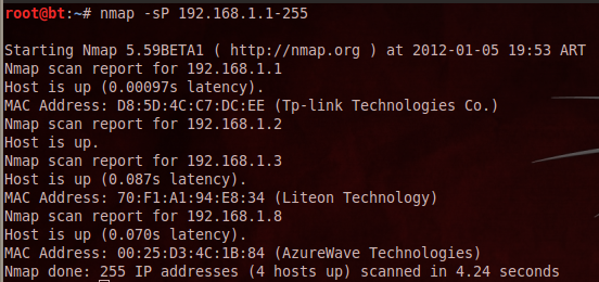 Nmap –sP 192.168.1.1-255
